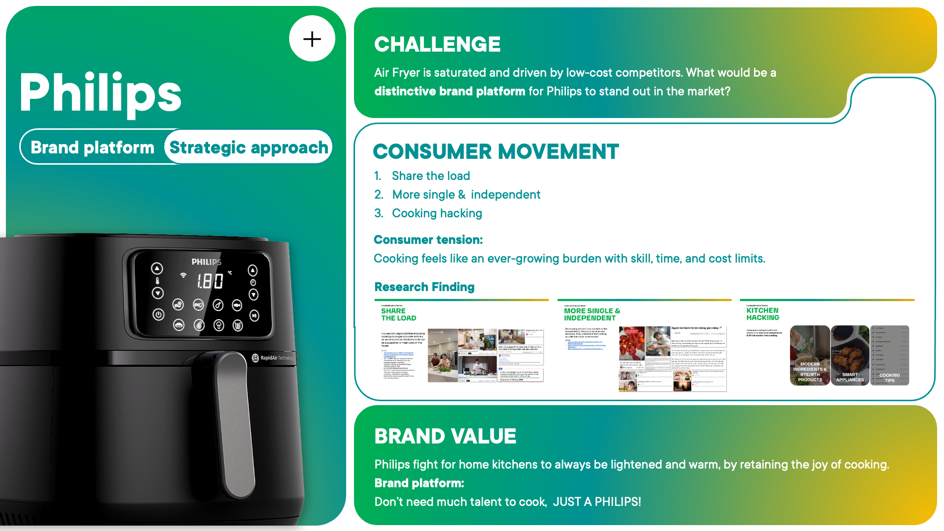 This project translated consumer tensions around cooking into a distinct brand platform, informed by a broad understanding of consumer movements and their potential impact on brand value.